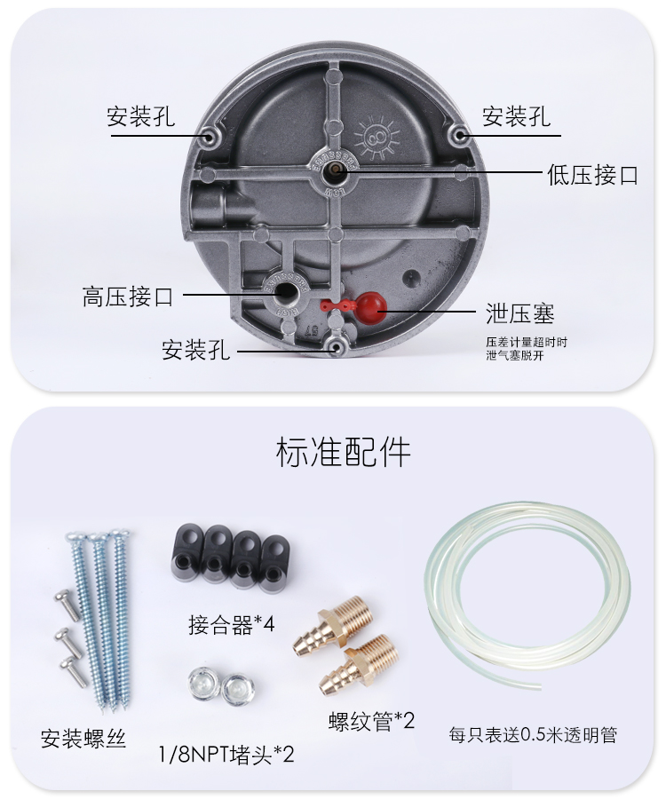 標準附件:一根1m長的軟管,兩個 1/8? NPT 堵頭,兩個 1/8?連接軟管的接頭,和三個嵌入式安裝用的配件以及螺釘